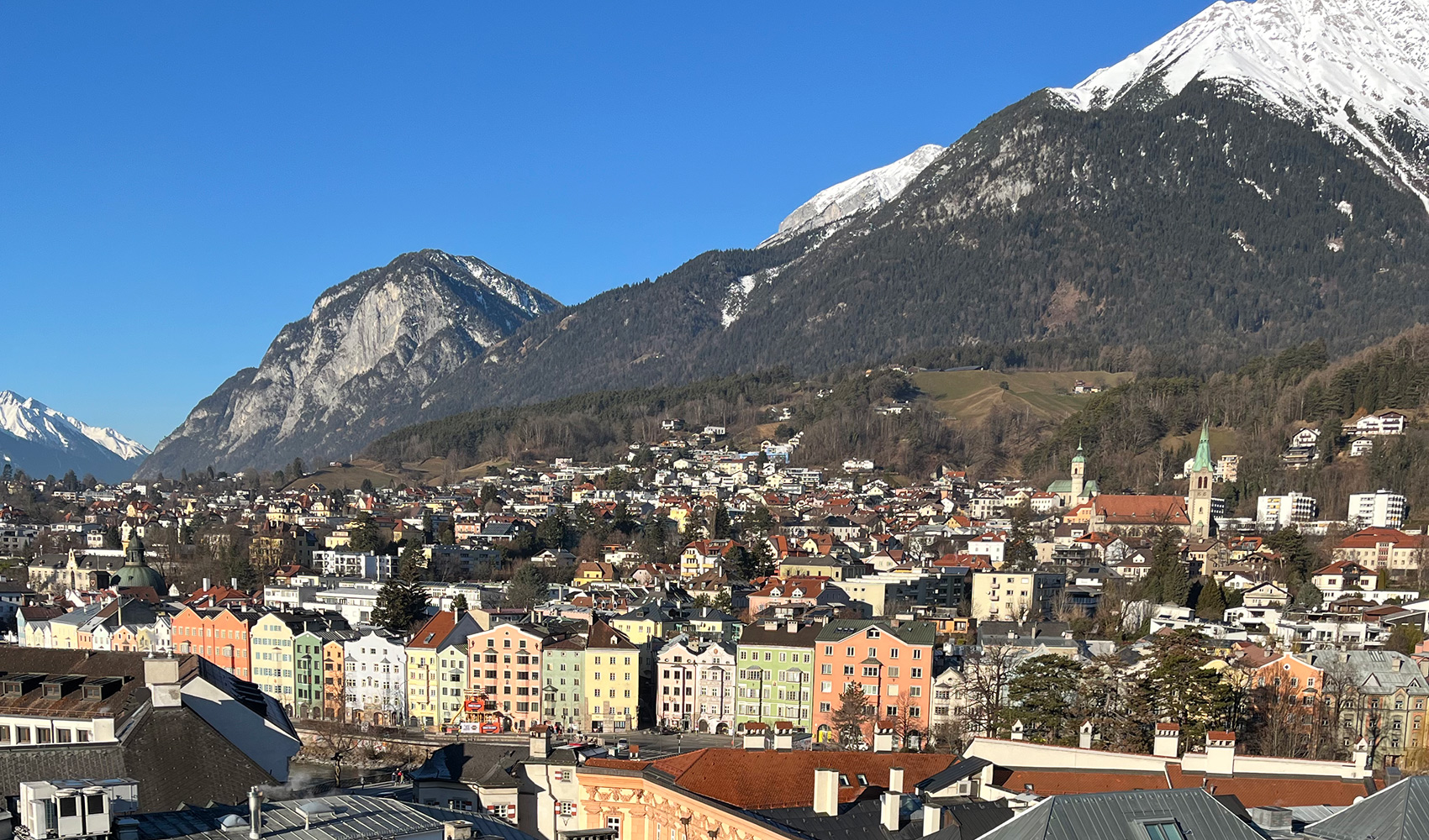 Yksi Innsbruckin tunnetuimmista ja kuvatuimmista maisemista löytyy Markthallen ja Innbrücke-sillan lähettyviltä, jossa värikkäät barokkitalot seisovat rivissä joen pohjoisrannalla. Taustalla kohoaa Nordkette-vuoristo ja kirkkaana päivänä näkymä on kuin postikortista.